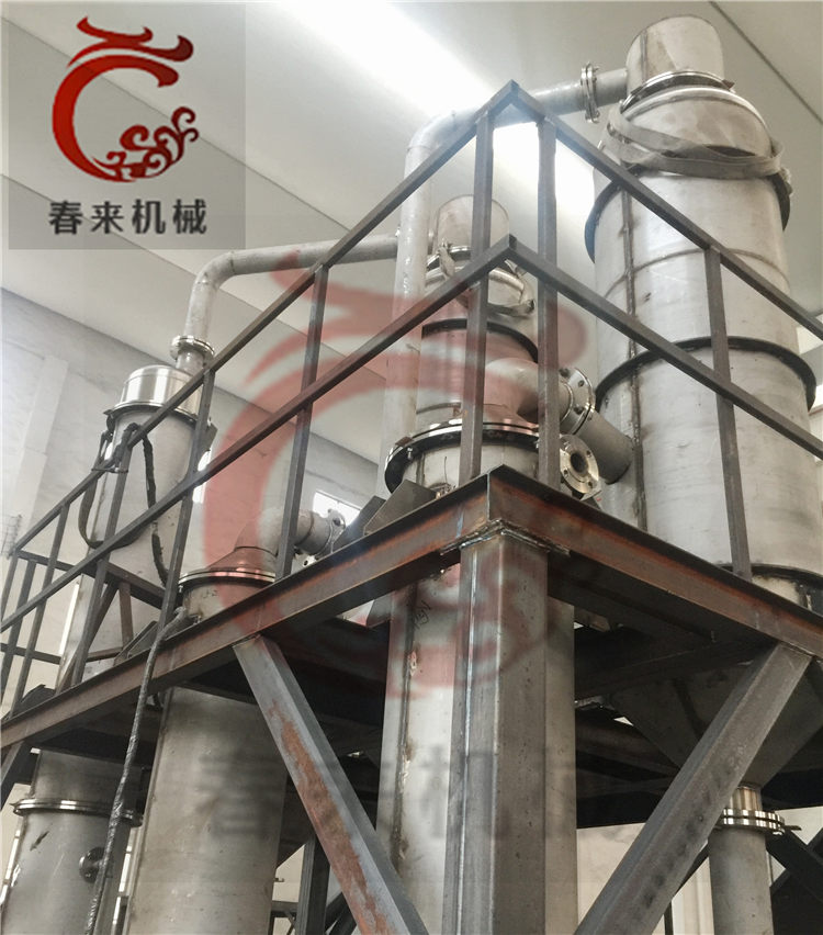 一效、二效、三效加热器、一效、二效、三效分离器(汽液分离、结晶器)、预热器(末效蒸汽、盘管预热或列管预热)、冷凝器、冷凝水储罐、真空泵、循环泵(过料)、强制循环泵、冷凝水泵、结晶(稠厚)釜、旋液装置、母液罐、离心机、电气仪表控制及阀门、管路等组成。